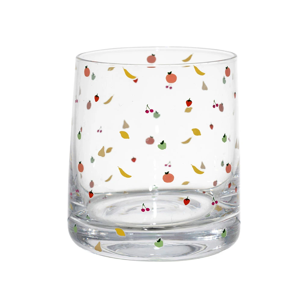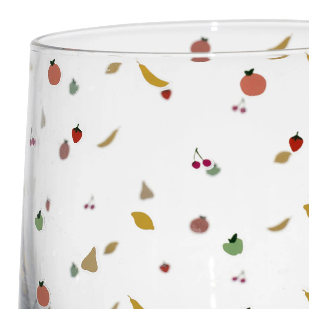 Ajoutez une touche de gaieté à vos boissons avec ce gobelet en verre de 25 cl, décoré de motifs de fruits multicolores.
