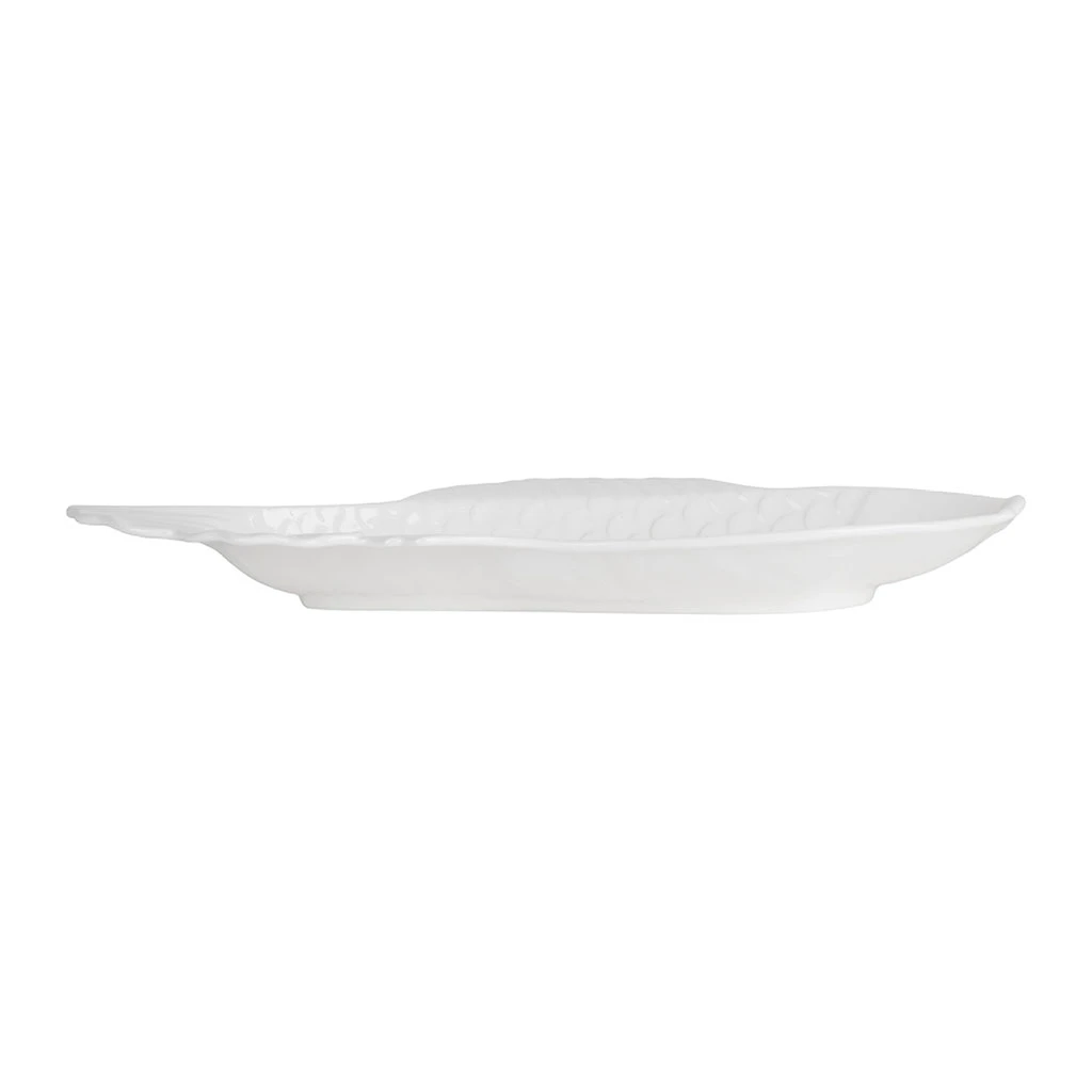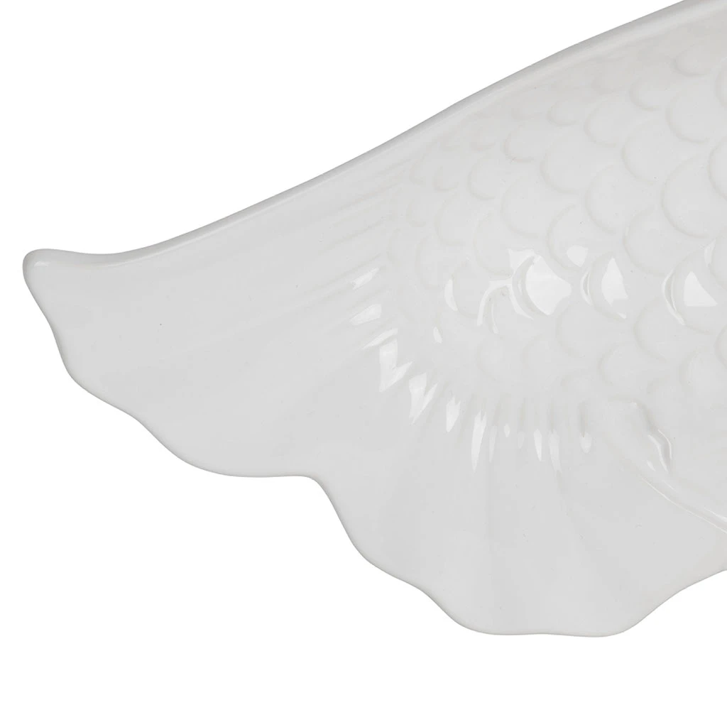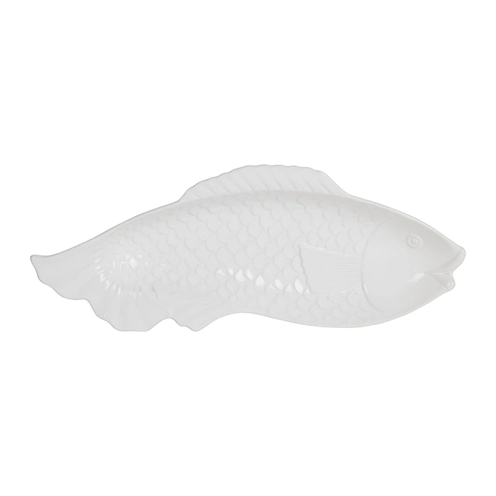 Ce grand plat creux en faïence blanc adopte une forme de poisson qui ne passe pas inaperçue.